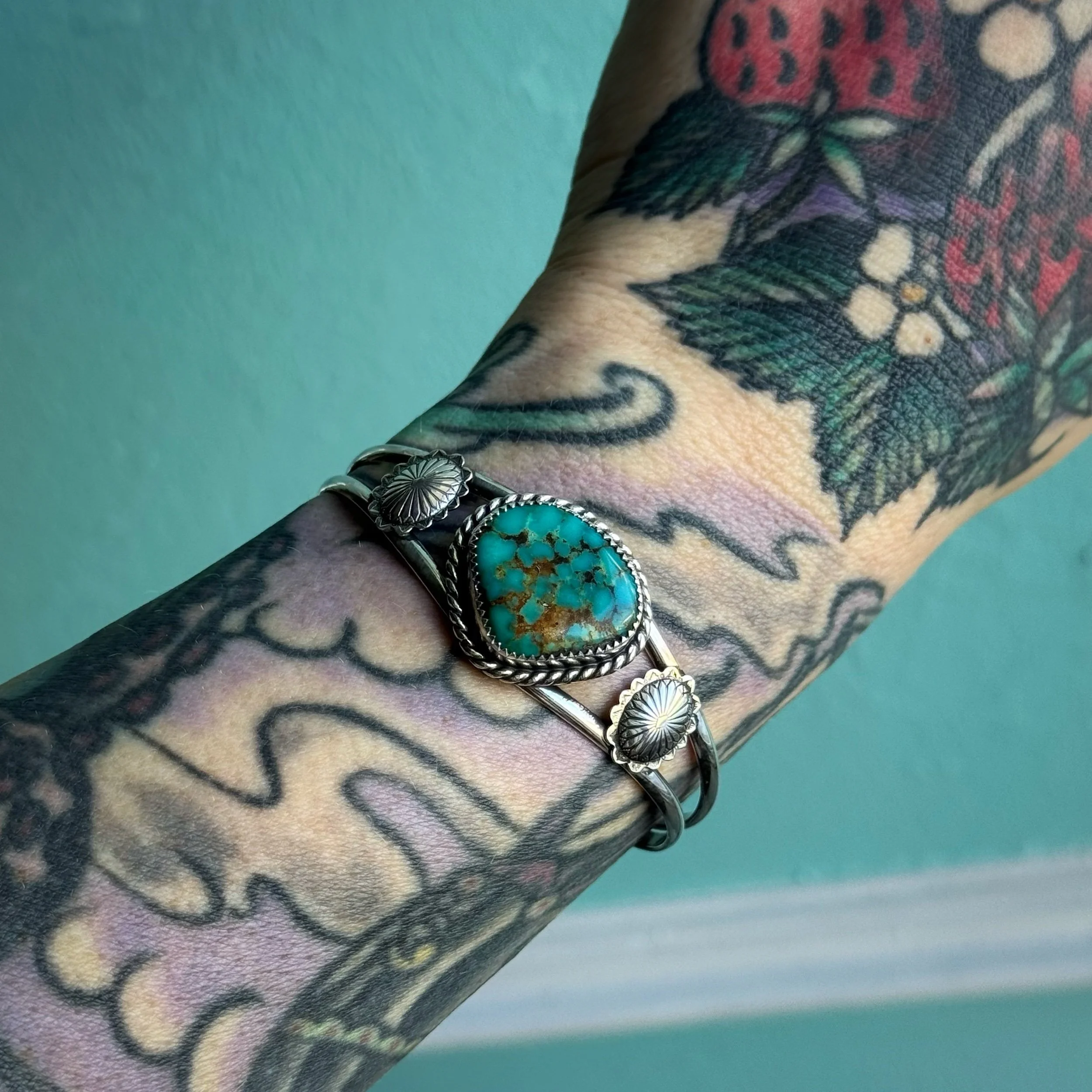 Gorgeous old stock turquoise, adorned with two .925 sterling silver conchos